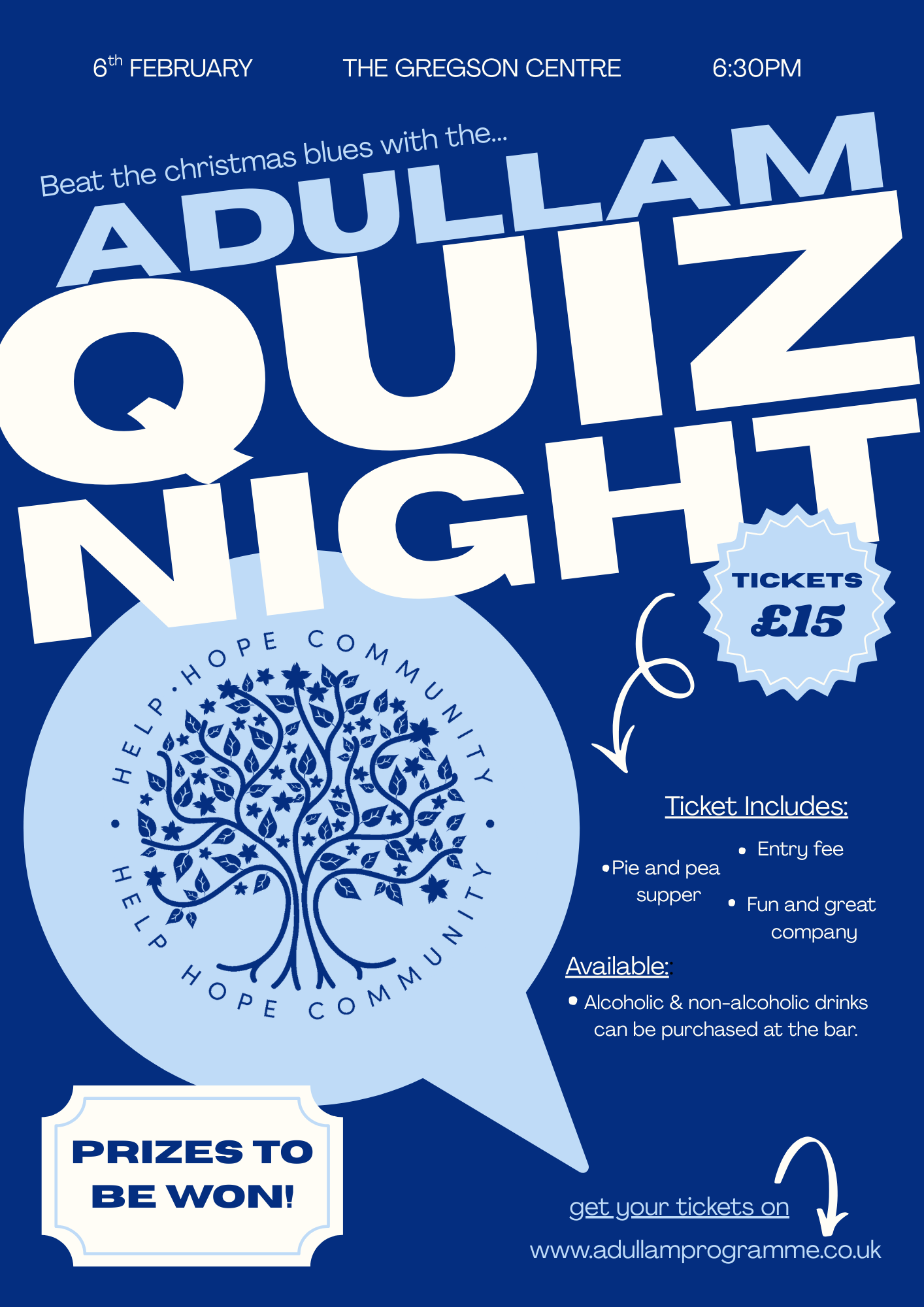 Join us for the Adullam Quiz Night on Friday 6 February. Hot food is included in your ticket with an option of either a meat & potato or chess & onion pie supper. Gather your friends and family, form a team, and enjoy an evening of fun, laughter, and friendly competition!